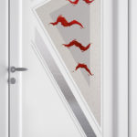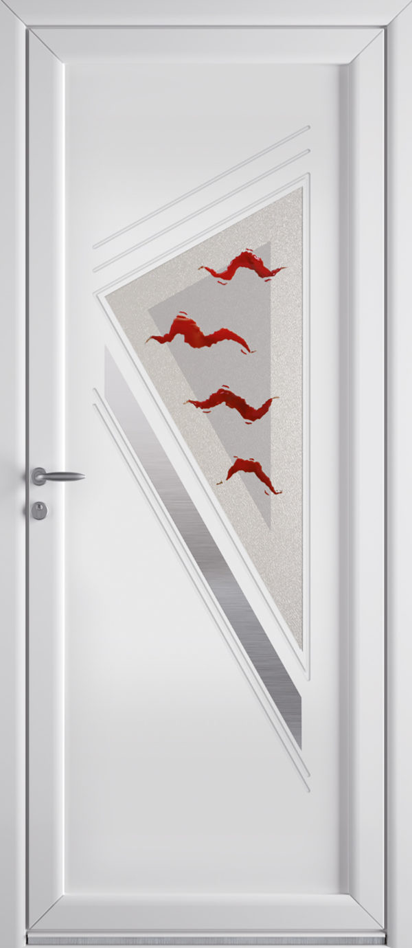 Porte composée d’un vitrage dépoli de forme triangulaire et d’un insert inox