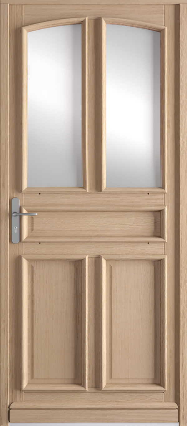 Porte en chêne brut composée de vitrage clair et de petits-bois intégrés brossé sans croix