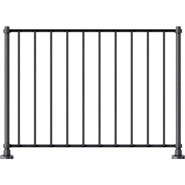 Habillage fixé entre poteaux, composé d’un barreaudage de Ø 20 mm vissé entre deux lisses de 23 x 35 mm.