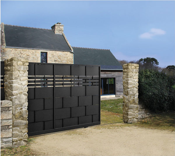 – Coulissant : kit coulissant acier (poteau guide + guidage, poteau gâche + platine d’arrêt, rail galvanisé)