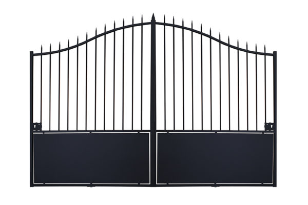Le portail Excalibur est proposé en ouverture battante ou coulissante. Il est de forme chapeau de gendarme. Il est donc plus haut au centre que côté piliers. C’est un portail haut et festonné qui saura préserver votre intimité.