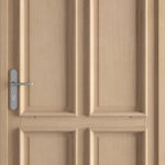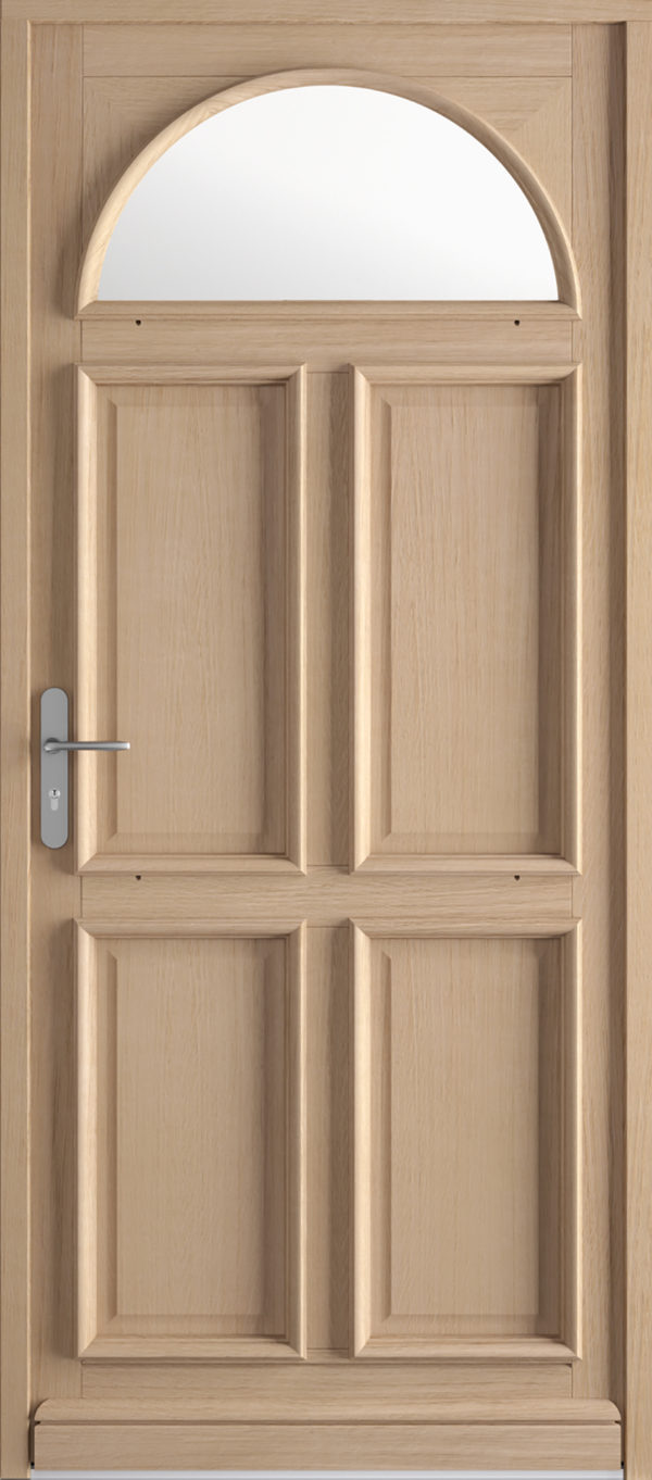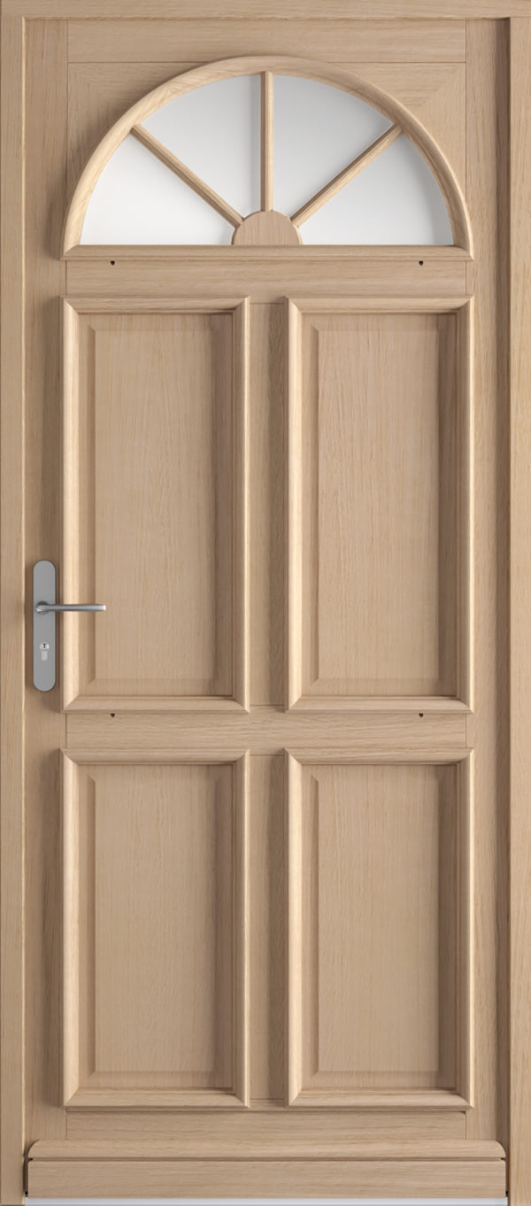 Porte en chêne brut composée d’un vitrage clair, de petits-bois rayonnants intégrés et d’une rosace en laiton