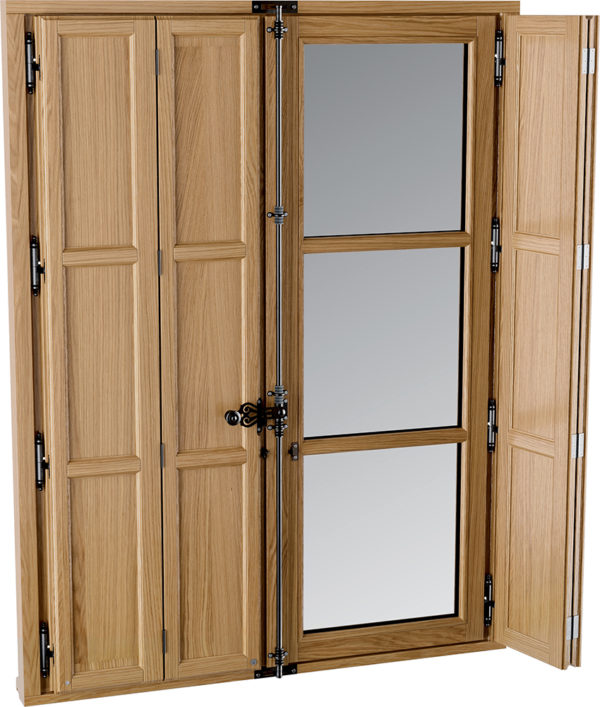 Conception traditionnelle avec traverse(s) intermédiaire(s). Volet mouluré côté intérieur et extérieur. Disponible en 1 vantail ou 2 vantaux repliable(s). Composition des vantaux selon dimensions de la fenêtre. Essence et coloris assortis à la menuiserie »