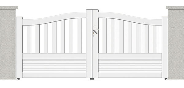 – Battant : serrure encastrée avec cylindre européen et clés plates, pivots à monter sur crapaudines et plaques à visser. Sabot automatique et arrêts poussoirs.