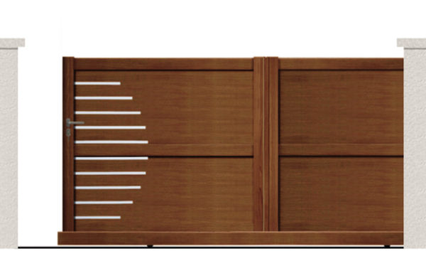 Santos est un portail plein composé d’inserts en aluminium brossé, ce qui lui donne un aspect chic.