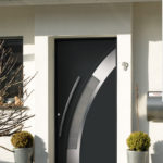 Porte composée d’un vitrage dépoli, d’inserts en inox et d’un insert affleurant
